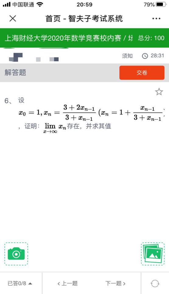疫情之下,今年校内选拔赛与以往形式不同。5月23日,全国大学生数学竞赛校内选拔赛在智夫子在线考试平台顺利举行,共有403位同学报名参加此次选拔赛。本次考试在智夫子在线考试平台进行,学生使用答题手机进入在线考试系统,监考手机进入视频监控模式,并实现了考试题型全覆盖、学生证件上传、监考端与答题手机端的有效控制技术、网络流水阅卷等多项功能,模拟了线下考试的全过程,有效保证了竞赛的公平公正性。