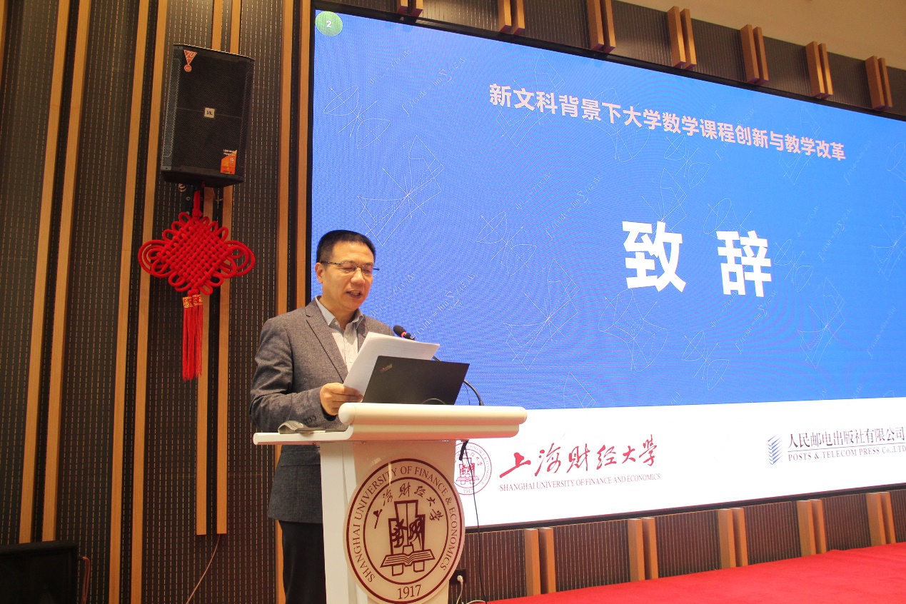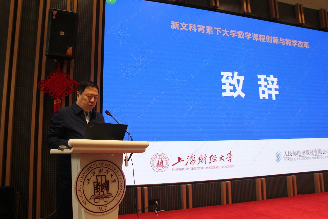 开幕式由上海财经大学数学学院院长程晋主持。上海财经大学常务副校长徐飞、人民邮电出版社社长顾翀先后为本次大会致辞,对前来参会的嘉宾表示了热烈欢迎,强调了新文科建设的重要性以及大学数学课程与教材建设的重要性。