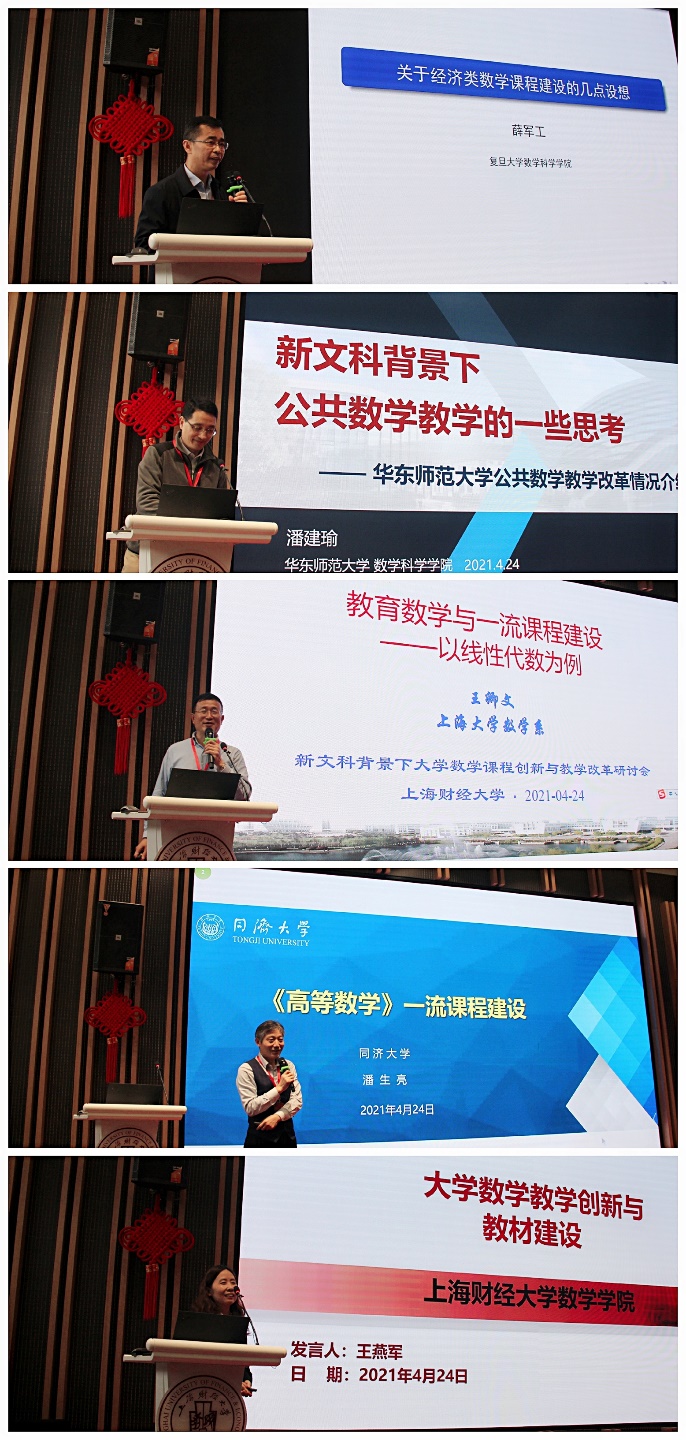下午,由复旦大学数学科学学院副院长薛军工、华东师范大学数学科学学院副院长潘建瑜、中国高等教育学会教育数学专业委员会理事长王卿文、教育部高等学院大学数学课程教学指导委员会委员潘生亮、上海财经大学数学学院副院长王燕军依次带来大学数学教学模式与教学方法的分享。