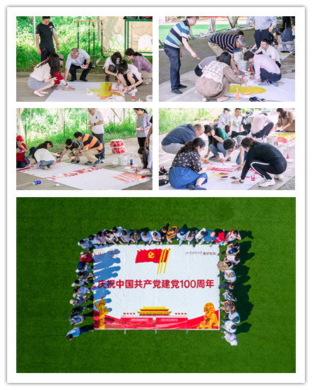 下午,在位于浦东的葵园红色革命教育基地中,参加活动的全体教职工,用时两小时,共同完成了一幅6米乘4米的天安门巨画,以此向中国共产党建党100周年献礼。老师们顶着烈日,顶着35度的高温,虽汗流浃背,但没有一个人叫苦叫累。所有人分工合作,齐心协力,共同用行动诠释着对党和祖国的热爱。