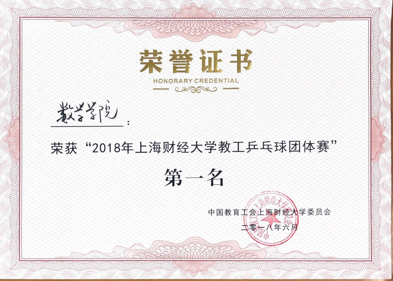 2018年6月5日,2018年上海财经大学教工乒乓球团体赛落下帷幕,经过21支教工代表队的激烈拼杀,曾在2017年勇夺冠军的数学学院代表队实力出征成功卫冕,蝉联上海财经大学教工乒乓球团体赛冠军。
