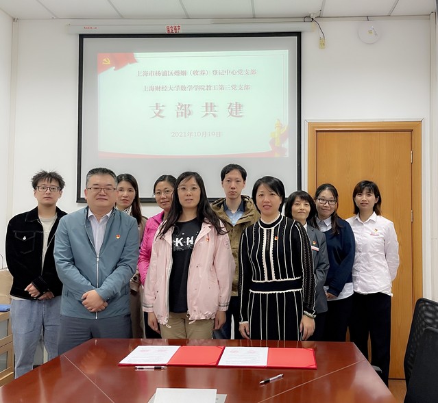 10月19日下午,在杨浦区婚姻(收养)登记中心519会议室,上海财经大学数学学院教工第三党支部与杨浦区婚姻(收养)登记中心党支部开展结对共建签约活动。
