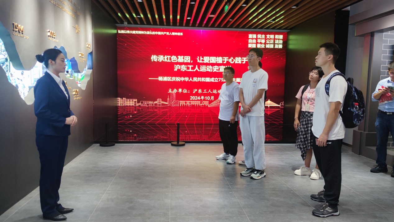 紧接着,“红色巴士”继续前行,最终抵达了沪东工人文化宫。在这里,大家共同参观了“百年杨浦工运”展览。展览通过丰富的图文资料、珍贵的实物展品以及生动的场景复原,生动再现了杨浦区作为中国工人运动重要发源地的光辉历程。党员教师们驻足凝视,仔细聆听讲解员的讲述,不时交流讨论,被前辈们英勇斗争、不懈奋斗的精神深深打动。