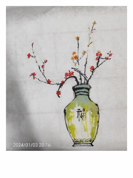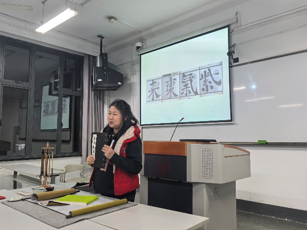 在书法分享环节,郎艳怀老师给同学们欣赏了自己创作的书法以及绘画作品,并从这些作品中体会中国古代人民造字的智慧。甲骨文、篆书等可以真切感受到象形文字的力量,能生动形象地反映这个字的内涵,如“冬”字的篆书,上半部分表示古代的“结绳计数”,寓示了一年的结束;下半部分则是“冰”,寓示了天寒地冻。此外,草书需要行云流水,一蹴而就;楷书则需要工整端庄,笔顺到位。各种各样的字体,都能体现中国文化的源远流长,并且从中感受到“筋骨”。