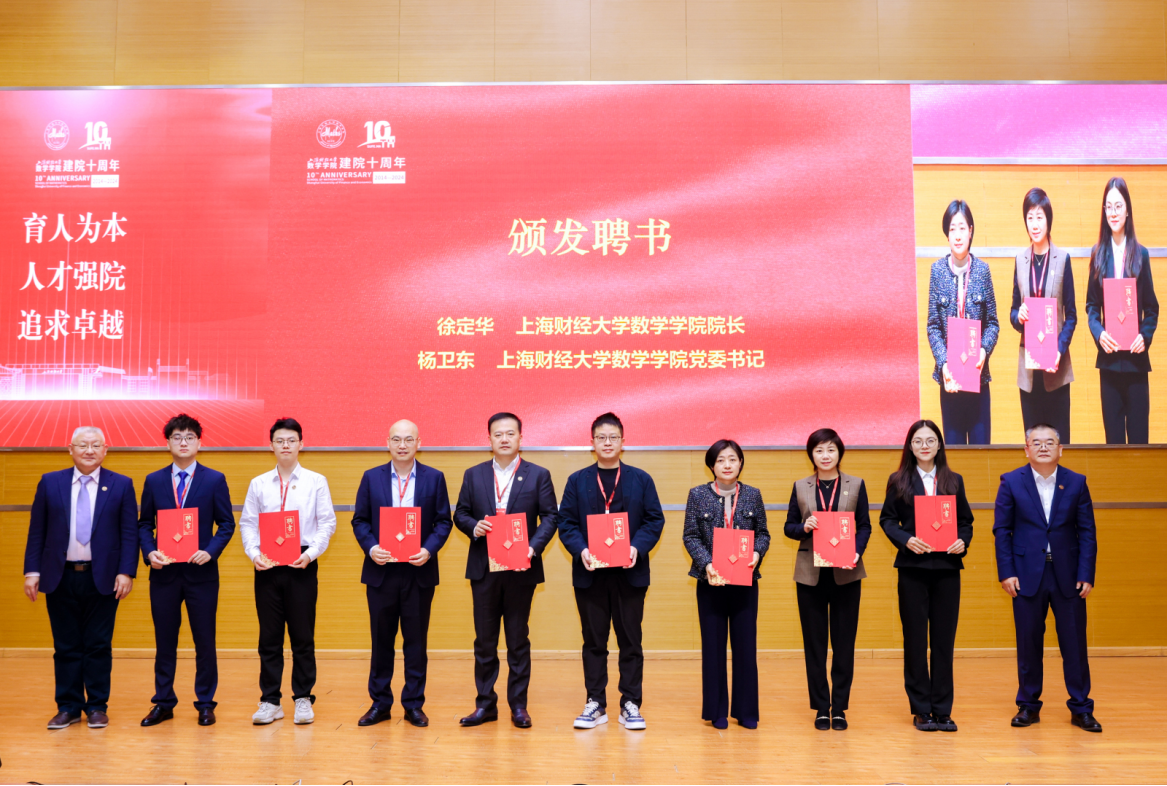 数学学院院长徐定华、党委书记杨卫东共同为上海财经大学校友会数学学院分会首届理事会负责人颁发聘书。