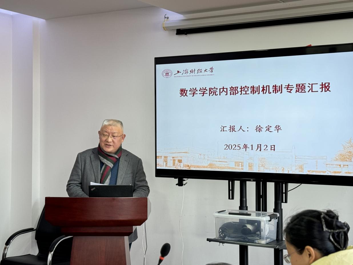 数学学院院长徐定华遵循管理之道与管理之术的辩证统一,在展示学院发展历程和分析学院事业发展经验的基础上诠释学院内控体系机制建设的重要性。他围绕学院内控体系中的组织架构与运行机制、制度体系优化、党委会与党政联席会制度、人事管理、财务管理、招生和培养管理等维度做内控工作做了引导性、概述性汇报。指出了学院目前内控难点和痛点,并结合实际情况对上财内控工作提出了建议,以期助力学院内控体系的进一步优化和完善,推动学院各项工作高效开展、高水平发展。