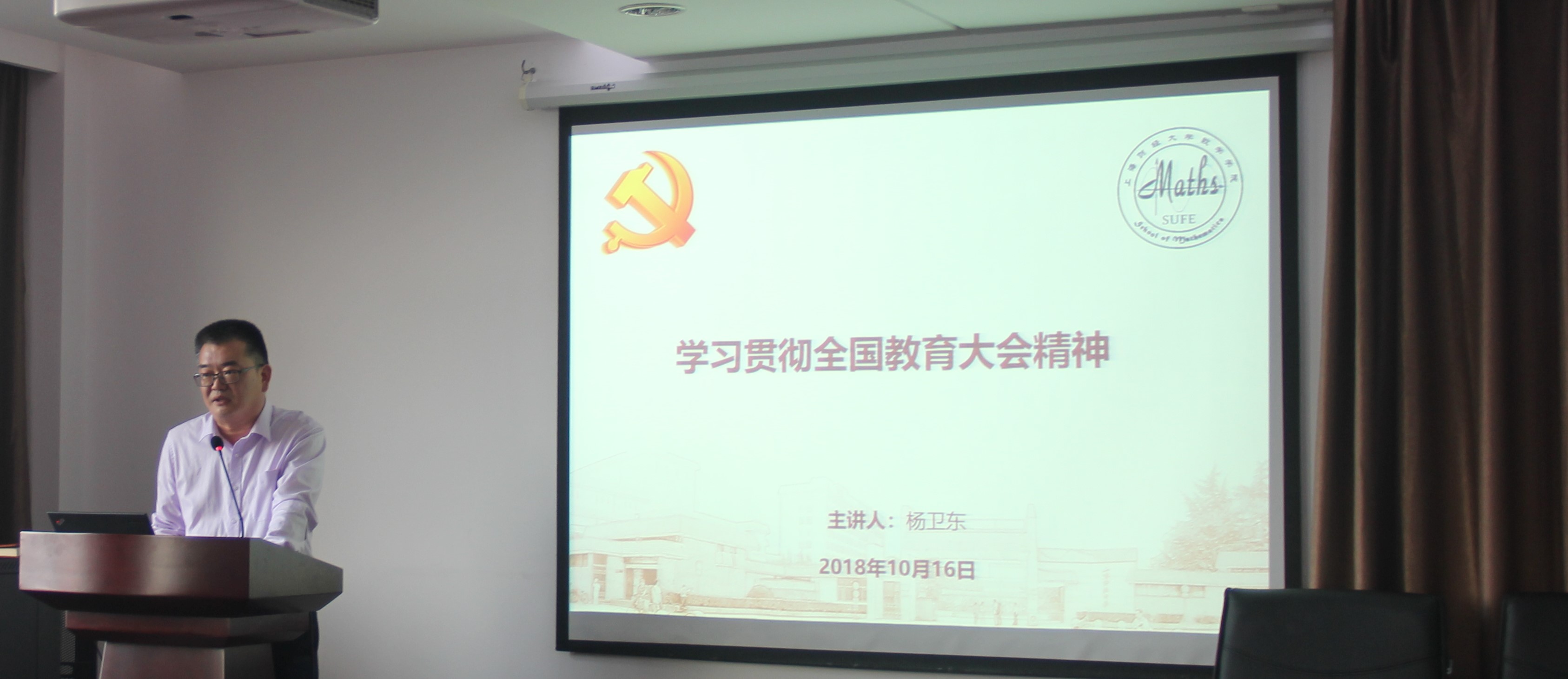 为贯彻党的教育方针,提高教师教书育人水平,将习近平总书记关于教育工作的新理念新思想新观点贯彻落实到实际工作中,2018年10月16日,数学学院党总支举办主题党日活动,召开全院党员大会组织学习9月全国教育大会精神,党总支书记杨卫东主持会议,向大家传达教育大会精神。党员大会后各支部以多种形式开展讨论学习活动。