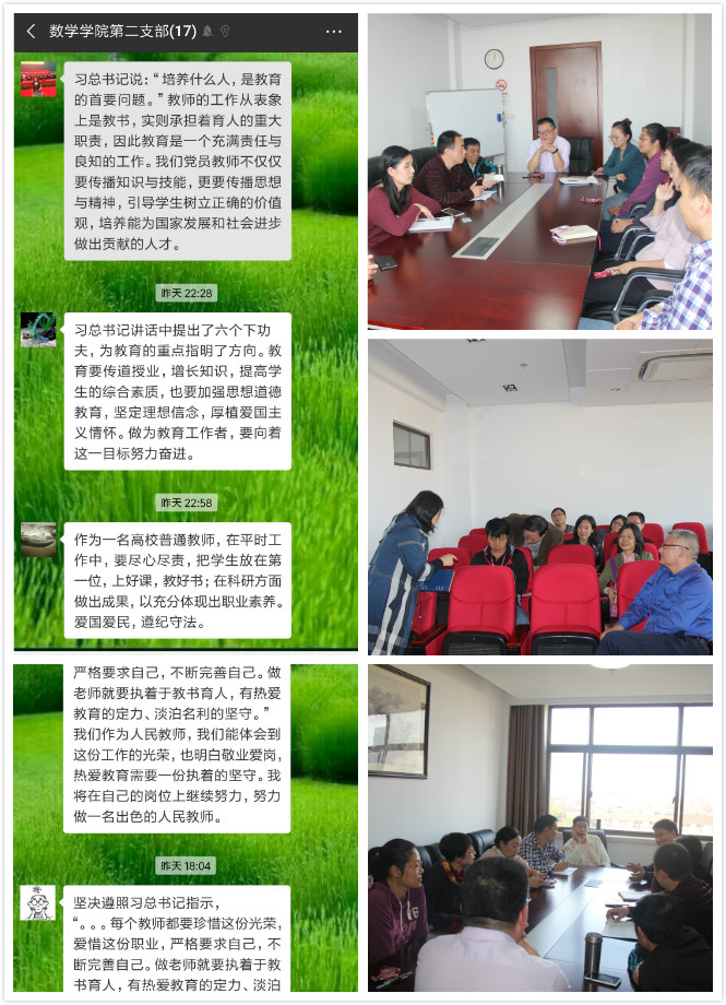 10月数学学院党总支书记、各党支部书记深入学习了近平总书记重要讲话精神和大会要求,总结学习心得,认真备课。党员大会上书记首先在全院党员大会上传达了全国教育大会上习近平总书记重要讲话和大会要求,组织全体党员学习中共教育部党组关于认真学习贯彻全国教育大会精神的通知,要求党员们认真学习切实把思想和行动统一到讲话和大会精神上来,将学习成果转化为推动学校和学院发展的具体实践。