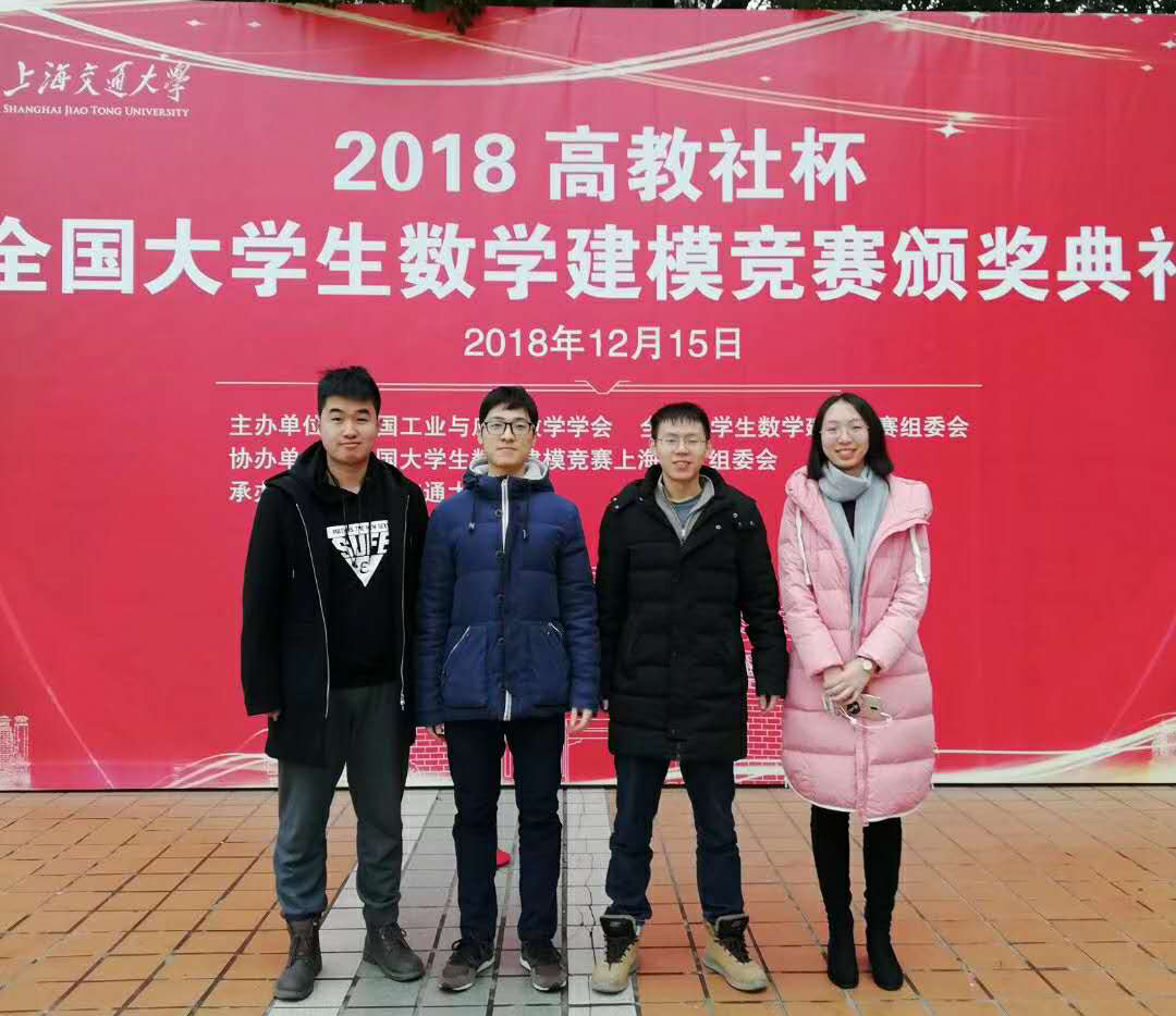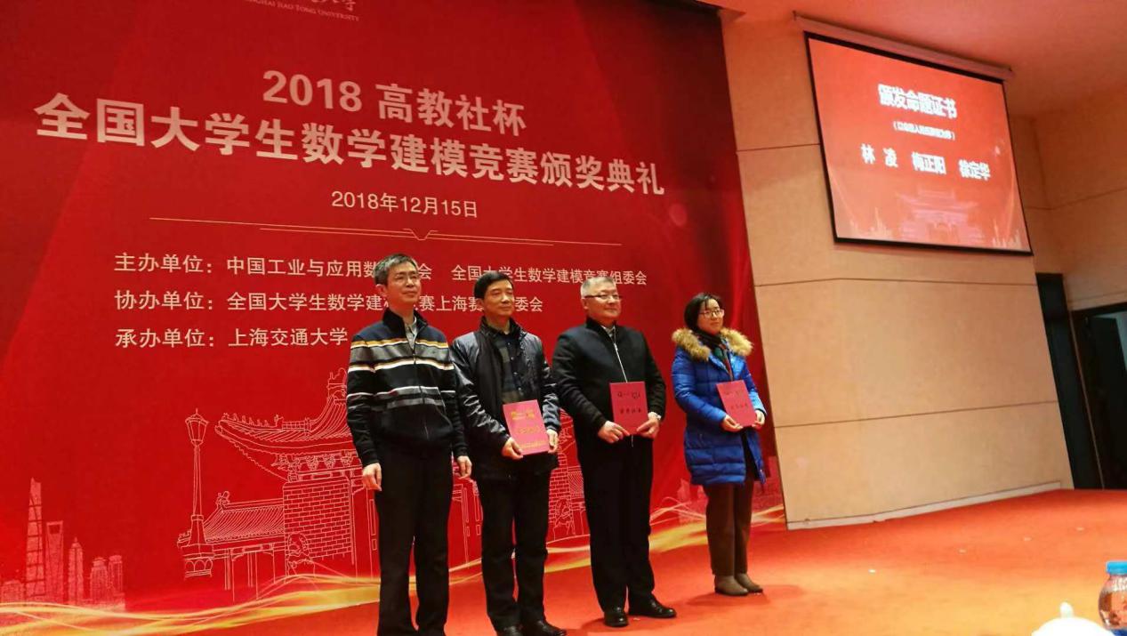 2018年12月15日上午9点,2018数学建模国赛全国颁奖会在上海交通大学闵行校区陈瑞球楼举行,数学学院副院长徐定华教授,建模负责老师、专家组成员董程栋教授以及全国一等奖获奖学生代表韦雨骁、蒋明威、杨鹏飞、李阳参加了此次颁奖。
