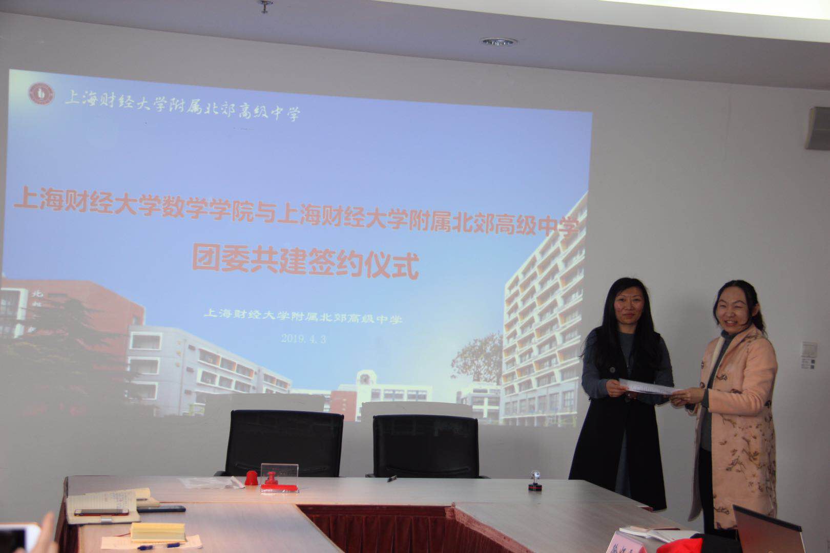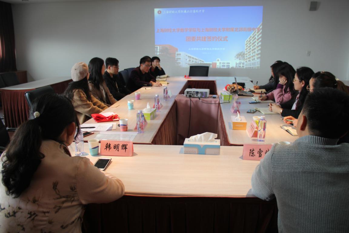 上海财经大学数学学院和上海财经大学附属北郊高级中学本着优势互补、资源共享、协同育人、共同提高的原则,通过积极协商,达成团委共建协议。4月3号下午,由数学学院党总支副书记韩明辉带队、学院辅导员和研究生助管一行前往上海财经大学附属北郊高级中学签订团委共建协议。本次签约仪式由上财北郊高级中学团委书记徐妍雯主持,上财北郊高级中学党总支书记陈雪斌、区团工委副书记甘婧文及学科青年教师代表共同出席签约仪式。