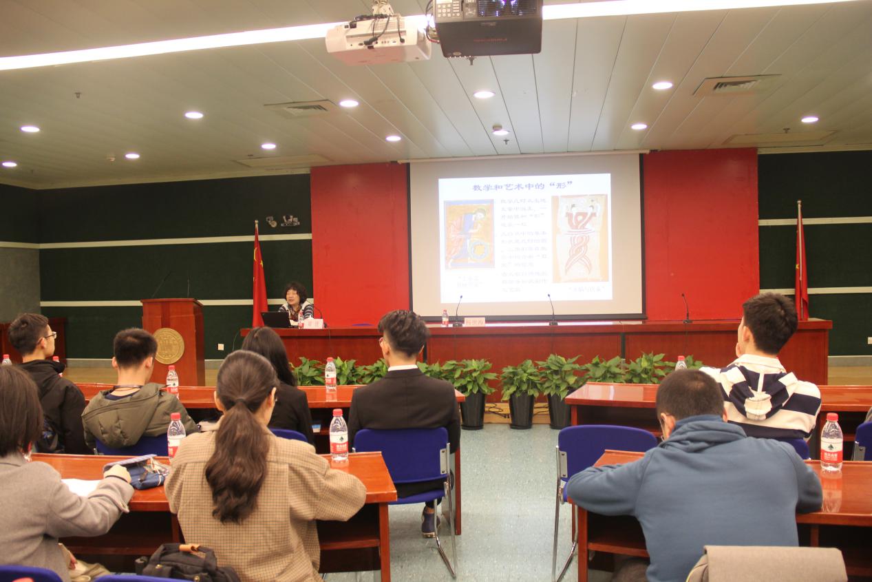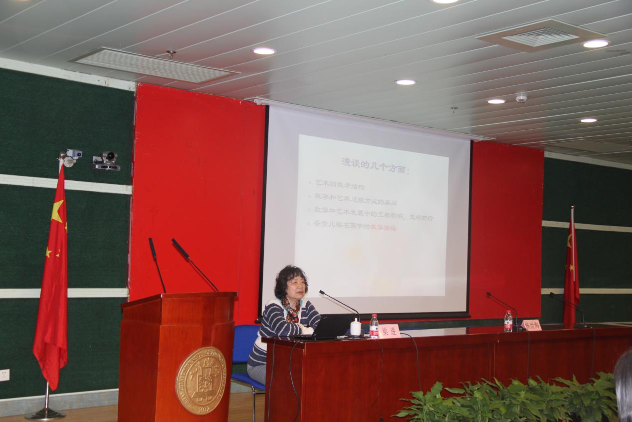 讲座伊始,杨世海老师先向大家介绍了讲堂的主讲人梁进教授的求学经历、学术专业方向及成果,介绍中还提到她所著《名画中的数学密码》获2018年4月“中国好书”,科技部“2018年全国优秀科普作品”,勾起了现场同学们对于讲座内容的好奇心。接着梁进老师带领现场同学们在数学和艺术的海洋中度过了有趣且有意义的一个半小时。她首先阐释了自己对于数学与艺术之间联通的理解,之后沿着历史的轨迹,与现场同学一起回顾了数学和艺术在发展中的相互影响、交织前行的过程,并同时鉴赏了名画中的数学密码。