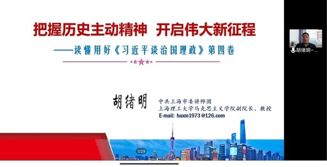 本次党课的主讲嘉宾为上海市习近平新时代中国特色社会主义思想研究中心研究员、上海理工大学马克思主义学院副院长、博士生导师胡绪明教授,他以“把握历史主动精神 开启伟大新征程——读懂用好《习近平谈治国理政》第四卷” 为题,为全院师生上了一堂生动的党课。