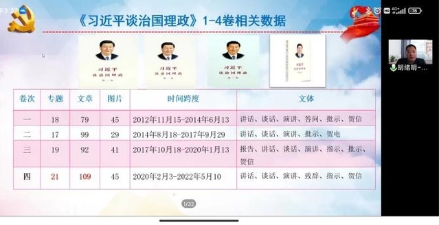 胡绪明教授将《习近平谈治国理政》第四卷的新特点概括为“五个新”:新征程、新成果、新认识、新贡献与新范畴。《习近平谈治国理政》第四卷在延续呈现坚持和发展中国特色社会主义核心主题、“五位一体”总体布局、“四个全面”战略布局,以及国防和军队建设、外交工作、港澳台工作等方面,深化概括了党的理论创新成果,作出了科学的战略指引;他表示,学习领会《习近平谈治国理政》第四卷,在于充分理解马克思主义中国化最新成果、全面把握三大时代课题与三大历史规律、系统领会“四个之问”的科学回答、深刻把握构建大安全格局的战略要义。专题党课对下一步深入学习贯彻《习近平谈治国理政》第四卷提供了宝贵指导和学理支撑。